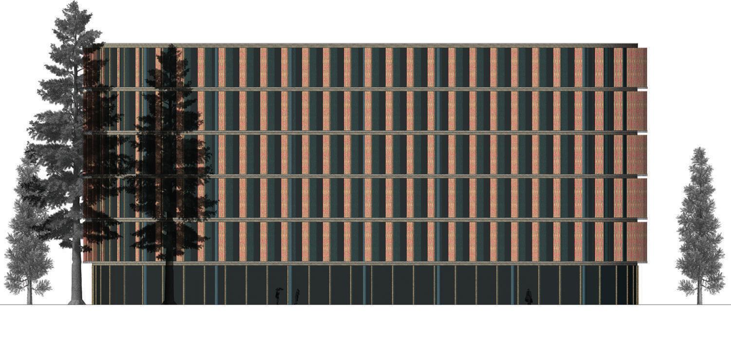 The storey building shape represents a rectangle with rounded corners, the facade is a curtain wall made of glass and wood to ensure as much light as possible gets inside.
