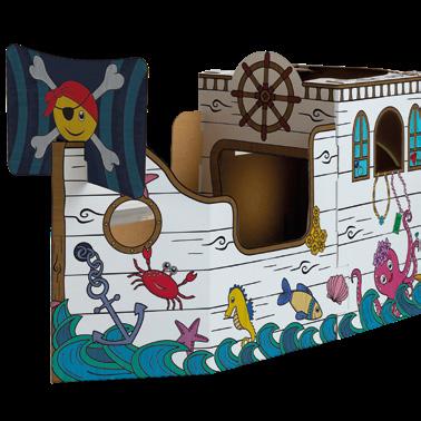 Set sail for creative adventures with the Colour-In Pirate Ship. Children colour sea creatures and treasure, then play with an interactive door and ship details. Made from strong FSC® certified cardboard, simple no-tools setup, water-based inks, CE/UKCA compliant.