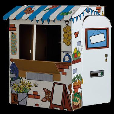 Encouragez le jeu avec le supermarché XL à colorier. Les enfants colorient des fleurs, animaux et produits du marché puis jouent grâce aux fenêtres et portes mobiles. Fabriqué avec du carton certifié FSC®, assemblage simple sans outils, impression avec des encres à base d’eau et entièrement conforme aux normes CE.