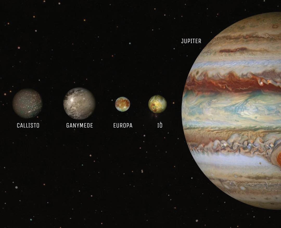 The moon Europa is a fascinating place. It's covered in a thick layer of water ice, by thick I mean it's up to 30kms deep. Hiding underneath all this ice is a liquid ocean that probably has more water than all Earth's oceans combined. Many scientists are intrigued with the possibility of life existing in these oceans, personally I thinks it's very unlikely but given time we'll find out. Many people buy a small telescope and are not sure what to do with it, all the above is a great starting point, 50 to 75 times magnification will let you see some detail in the storms and you can look for a small reddish area, the great red spot, a major storm that has been going on for decades.