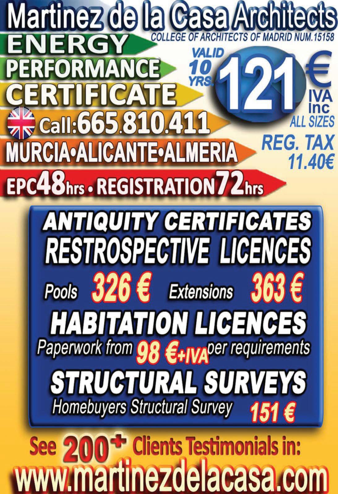 Martinez de la Casa Architects is your trusted leader for Architectural Certification in Southern Spain, offering Energy Performance Certificates (121€ inc IVA) and Habitation Licences (prices vary by Town Hall). The price of a Pool Retrospective Licence (Certificate of Antiquity) is 326.70€ IVA Inc, and for all the Extensions in a property the cost is 363€ IVA Inc. For inquiries or appointments, call 665 810 411 (English) or explore www.martinezdelacasa.com to discover a remarkable collection of over 300 testimonials from our satisfied clients.