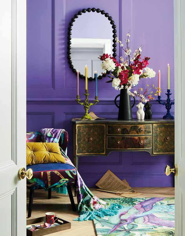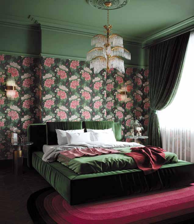 le bleu canard ou l’indigo sont des couleurs phares du style boudoir. Particulièrement élégantes, elles se marient merveilleusement bien avec les touches métallisées et les nervures marbrées. Côté motifs, les imprimés bucoliques – fleurs XXL ou paysages champêtres –constituent l’ADN de cette tendance maximaliste et pleine de charme. Aussi, les formes géométriques, sur fond noir, bleu marine ou teintées de doré, insufflent un côté Art Déco, glamour sans en faire trop. Et quoi de mieux qu’un papier peint, en accent sur un mur, pour apporter du relief et du caractère à la pièce sans la surcharger ? Enfin, les moulures murales (décoratives si on n’a pas la chance d’habiter un appartement haussmannien) accentuent le charisme d’une pièce et sont la touche finale d’une ambiance baroque.