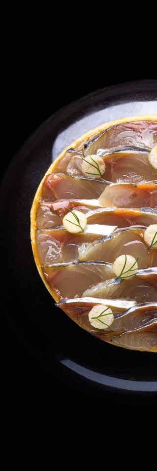 04. Dans le fond de tarte, déposer de la compote de pommes et d’oignons, puis les filets de maquereau. À l’aide d’un pinceau, tamponner légèrement le dessus de la tarte avec la marinade instantanée.