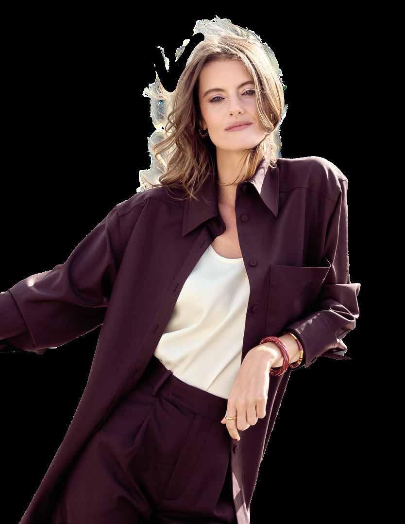 STYLISME : Ensemble pantalon et chemise : Margaux Lonnberg. Top en soie : Anine Bing Bijoux (bagues, joncs, boucles d’oreilles) : Aurélie Bidermann.