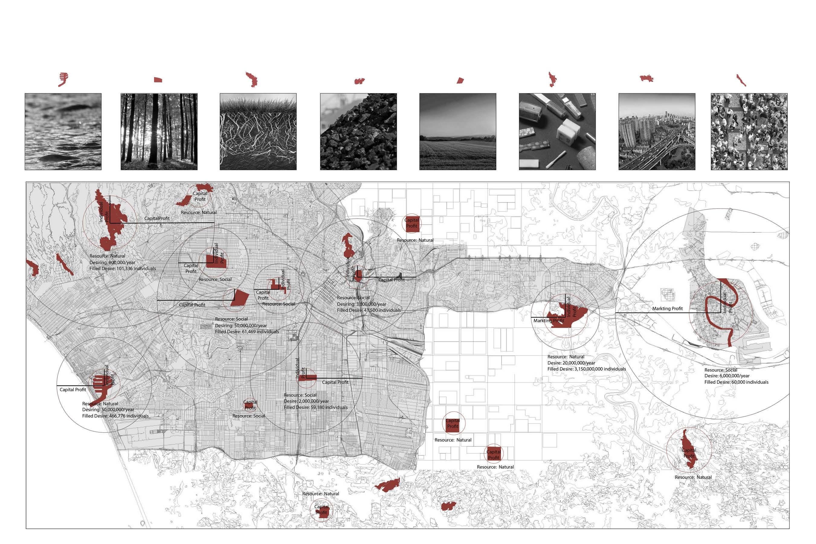 With Combining the representative sites( land, sea, suburb, country) to a hybrid map. By comparing the number of residential (filled desire) and the average annual travel (desiring) on this map, it shows a stronger trend of site desire growth in areas where Capital controls resources.