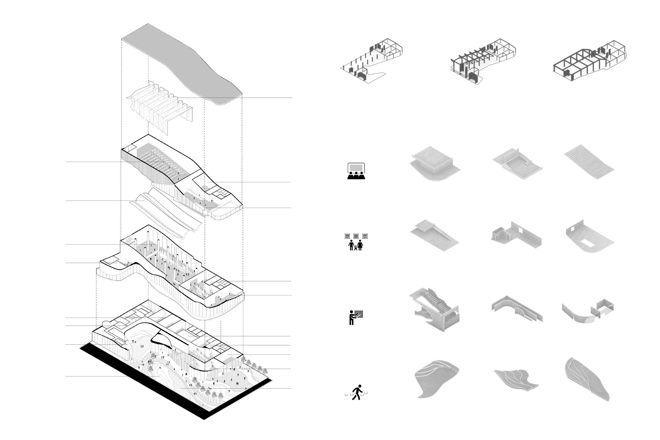 Pappajohn Sculpture Park is a city landmark landscape in Ames, IA. It is full of potential to become a cultural center in the city. However, the surrounding buildings are not welcome to visitors who expect to travel around the site. Could a building as a multi-function space welcome visitors thus prosper the site tourism? This project proposed a multi-use contemporary museum concept based on elements extracted from the surrounding environment and building typology into contemporary museums. Thus cultural deliverables and educational landmarks emerged.