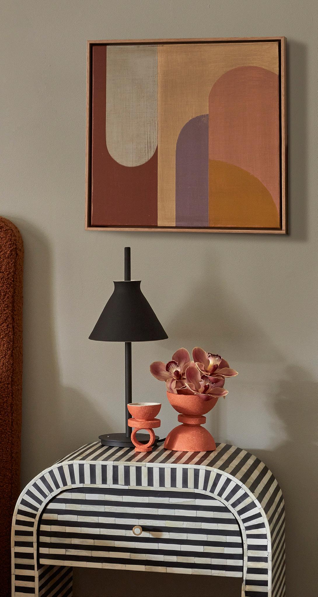 Left to Right, Top to Bottom: Zulta Cushion in Caramel Plaid | Bone Inlay Curved 1-Drawer Bedside Table in Stripe, Black Painted Summer by Denise Hojdyssek | Totana Table Lamp in Black | Squiggle Bedhead in Cinnamon Moon Throw in Harlequin Saffron | Winnie Chair in Cinnamon | Zulta Cushion in Tan Tribal Woodrow Half Moon Marble Bedside Table in White