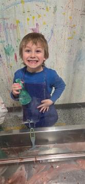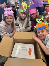 Students in Mrs. Laine's classroom attended a social group. The group read the book "Boxitects" by Kim Smith. They were then split into 3 groups and worked together to decorate box houses. Over the next few weeks the students painted, glued on stickers, added streamers, and attached fabric. It was quite the ordeal! Students had to practice some patience, but in the end, they experienced what it is like to work as a team. A panel of judges arrived, and the students had to present their creations as a group. Prizes were awarded for: Most creative, Best Presentation, and Best Teamwork. As you can see in the picture, they were very proud of the box house they made together!