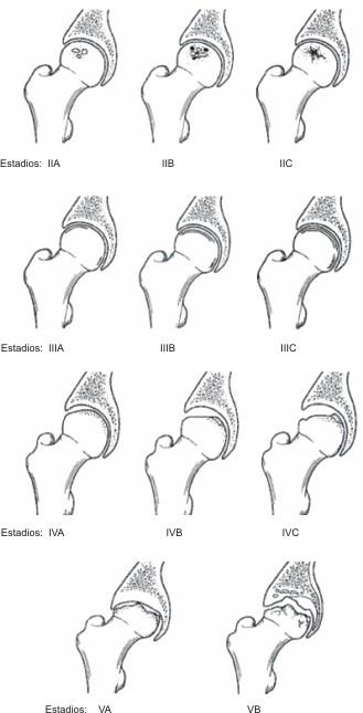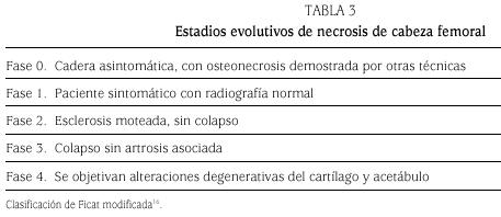 Clasificación de Fitcat y Arlet Estadio Línea articular Contorno de la cabeza Trabeculad o Diagnóstic o por Rx Diagnóstic o por exploración ósea Osteonecr osis Simple I Normal Normal Normal uosteoporó -tico Imposible Probable por pruebas hemodinámicas II Normal Normal Osteoporo sis o esclerosis Probable Histopatog enia certera Osteonecr osis Complicad a III Normal Aplanamiento (colapso del hueso subcondral ) Formación de secuestro Certero Confirmad a IV Estrechami ento Colapso Destrucció n del polo superior Muy difícil de diferenciar entre osteoartros is y osteonecro sis Insuficienci a hemodiná mica con necesidad de biopsia