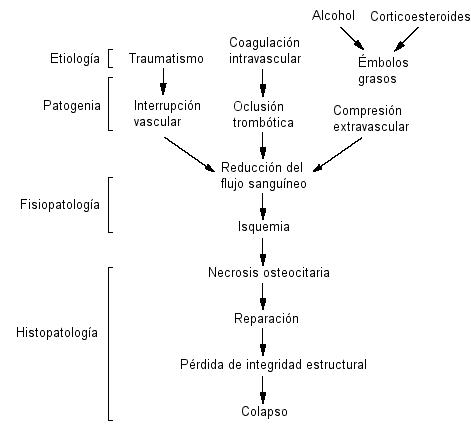 Patogenia de la osteonecrosis. Obstrucción intraluminal: desórdenes tromboembólicos, estasis venosa. Compresión vascular: presión mecánica externa, vasoespasmo . Disrupción física del vaso sanguíneo: traumatismo, fractura