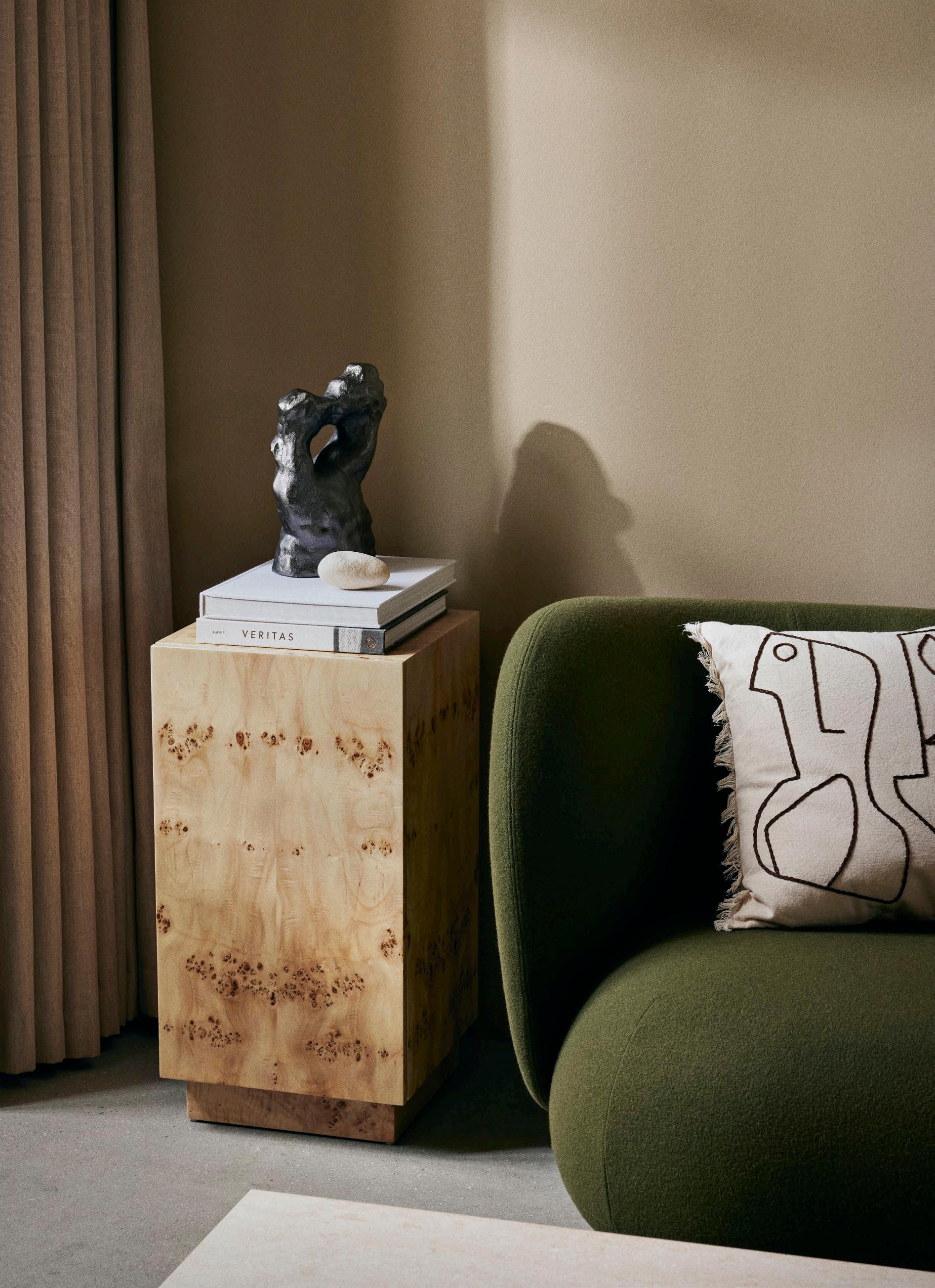Inspired by brutalism, the Rum collection presents pieces that are at once both comfortable and beautiful. With frames crafted from solid, FSC™ certified pine, their angular shapes are elegantly contrasted by pearl-like, spherical legs. The 100% linen upholstery not only enhances the aesthetic appeal of the collection, but also offers a delightful tactile experience.