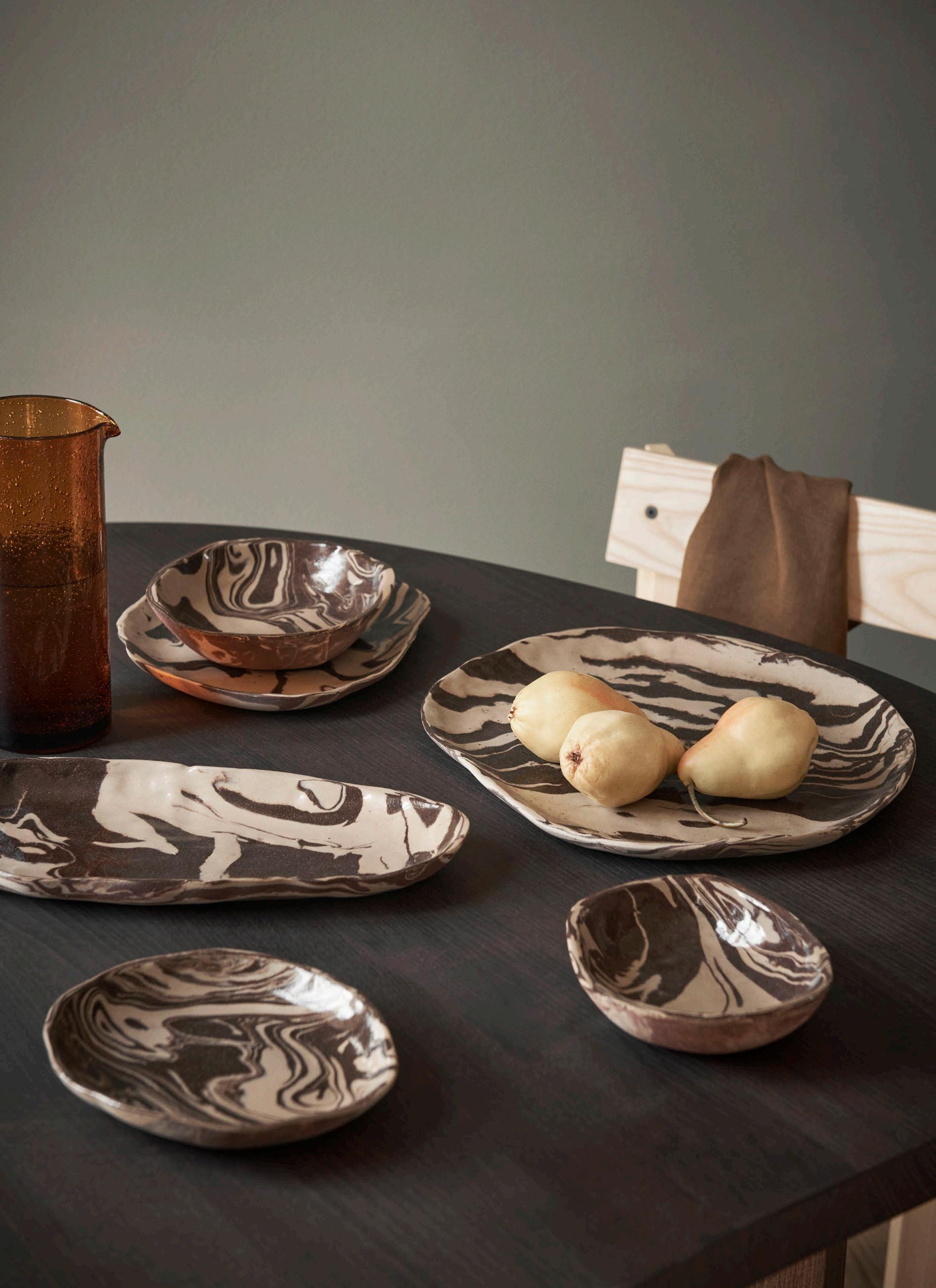 The Ryu tableware collection derives its name from the Japanese word for ’flow’, which refers to the intricate patterns that adorn these distinctive plates. Crafted using the traditional ‘Nerikomi’ technique, where two differently coloured clays are kneaded, rolled and cut by hand, this process results in one-of-a-kind patterns that are unique to each individual piece. Elevate your dining experience with these artful creations or showcase them on the wall as captivating statement pieces.