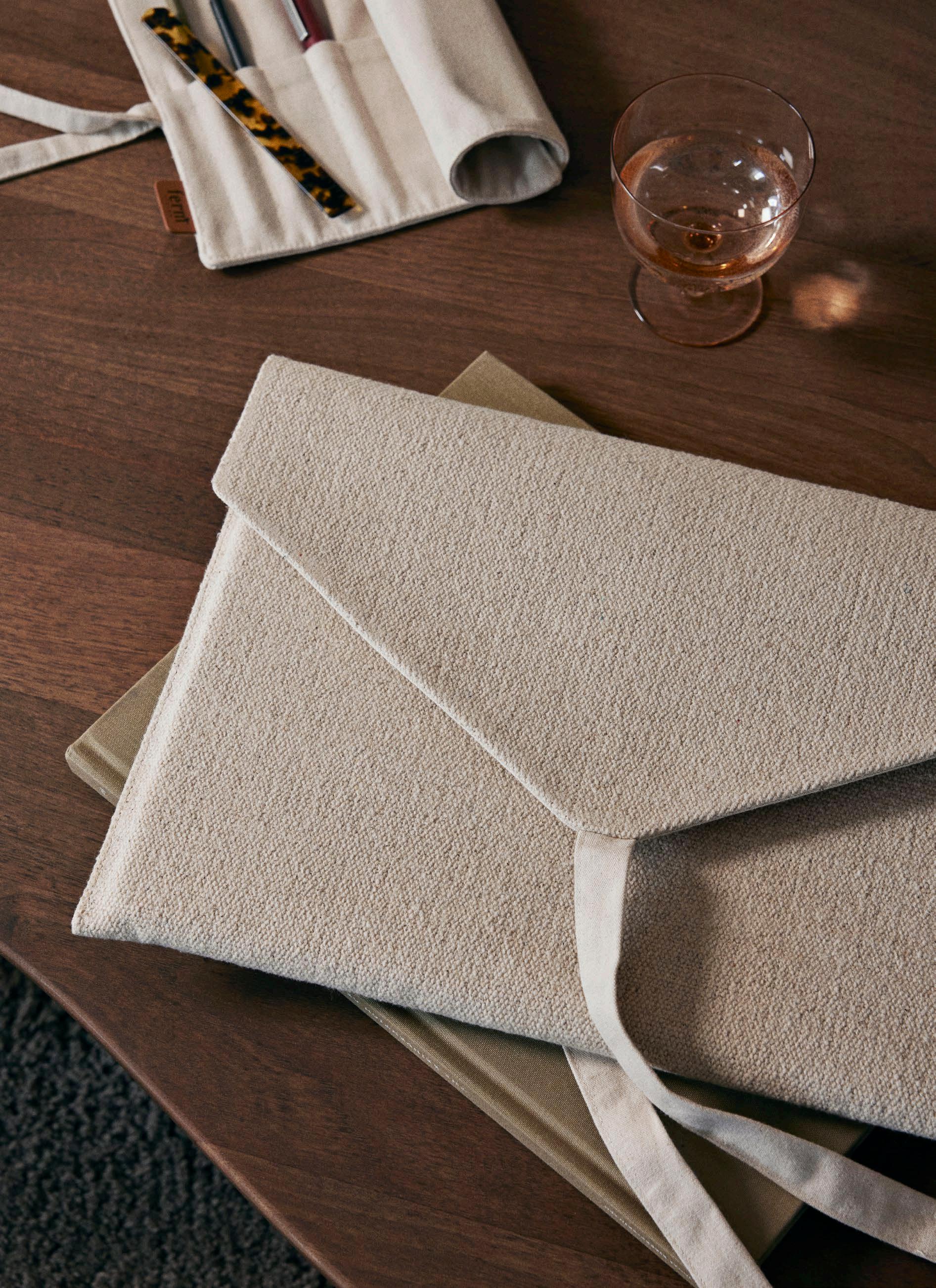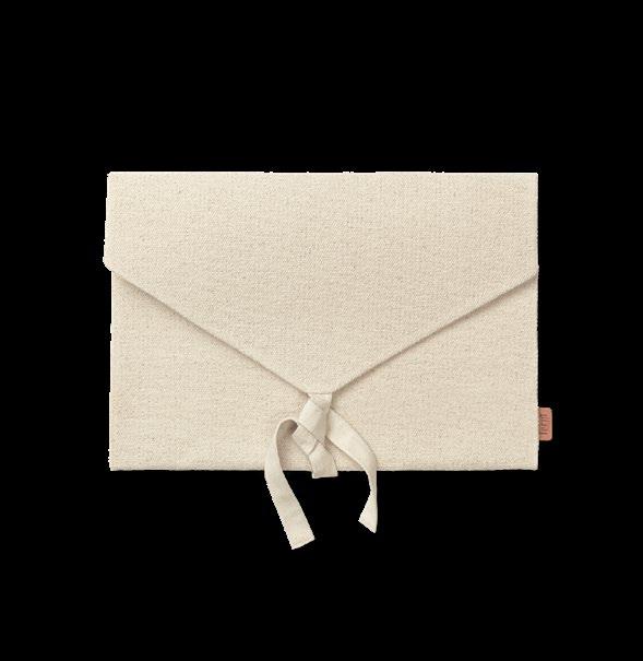 Crafted from textured and undyed GOTS certified, organic cotton, the Ally Pencil Wrap offers a simple yet elegant solution for storing and transporting pencils, pens and paintbrushes while the Ally Laptop Sleeve presents an elegant solution for storing your laptop or paperwork at home or on the go.
