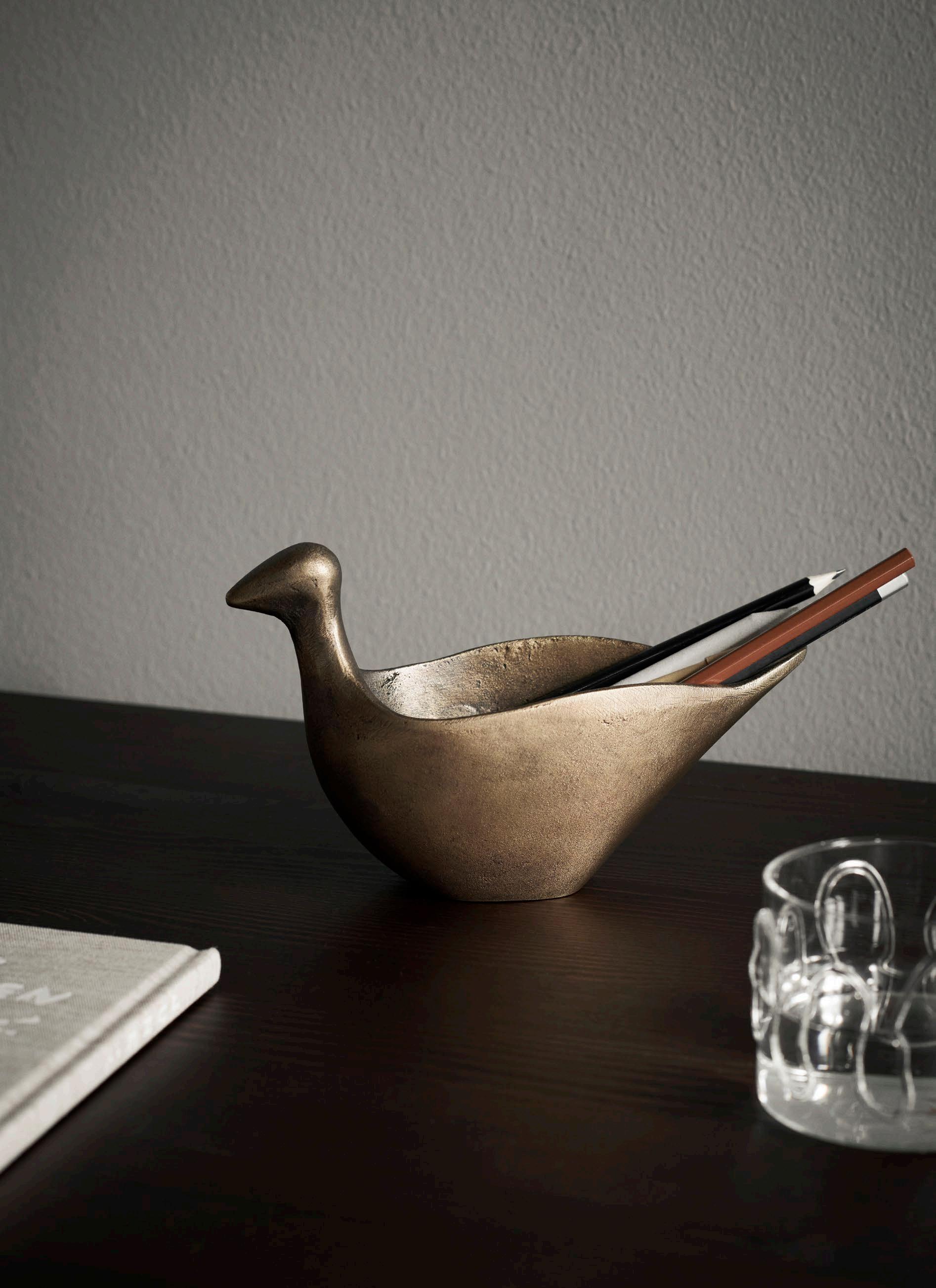 The sculptural Coot Paper Weight and Pencil Holder effortlessly merge practicality with aesthetic appeal. Made of cast recycled aluminium, their luxurious patinated finish draws inspiration from antique furniture. The Paper Weight can be fitted into the Pencil Holder.