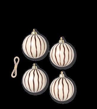 Painted by hand, this set of four glass ornaments lets you adorn your Christmas tree in a unique yet understated style. With an off-white base, each set features artfully uneven lines that have been painted with casual strokes. As every piece is painted by hand, each ornament will have a unique expression.
