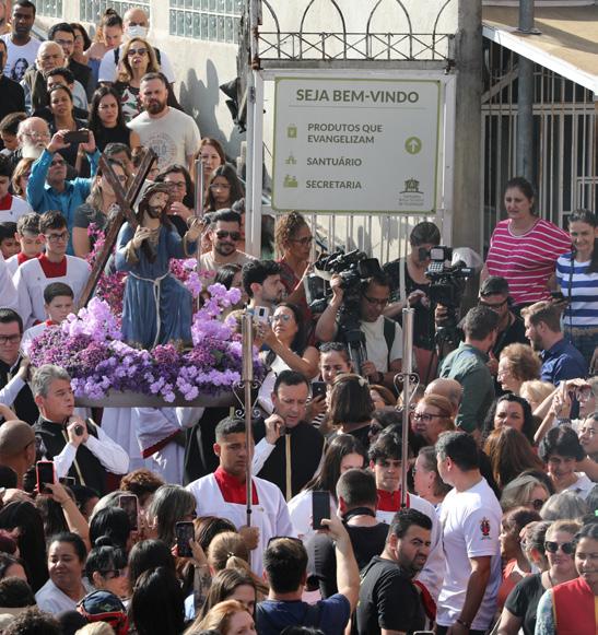 ruas ao redor do santuário. No Sábado Santo (4), a Vigília Pascal será celebrada às 19h, considerada a mais importante do calendário litúrgico, simbolizando a passagem das trevas para a luz com a ressurreição de Cristo. Já no Domingo de Páscoa (5), serão realizadas