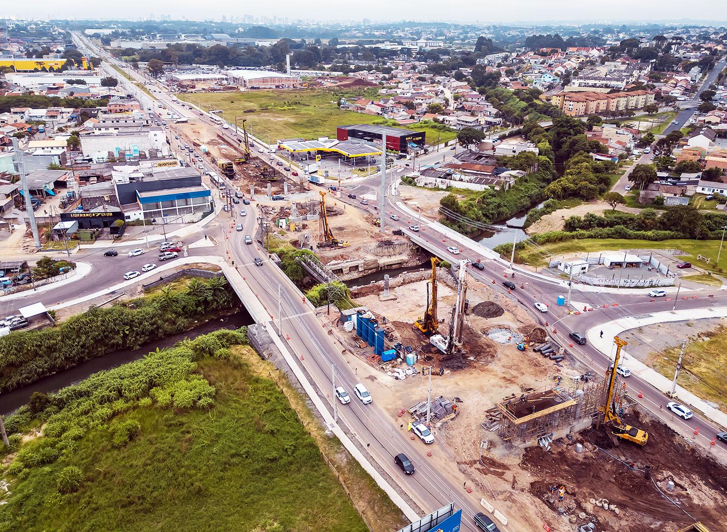 seguindo em bom ritmo. As intervenções já conferem um novo desenho para a região. As duas pontes estão em fase final de obras e já estão sendo usadas para desvio do trânsito para permitir a abertura de outras frentes de trabalho. A ponte anterior foi demolida e as equipes concentram atualmente os trabalhos na execução da fundação da terra armada nos dois lados, Curitiba e Pinhais. As vigas do novo viaduto, construídas no canteiro de obras, já foram todas concluídas e seguem em andamento os trabalhos de paisagismo.