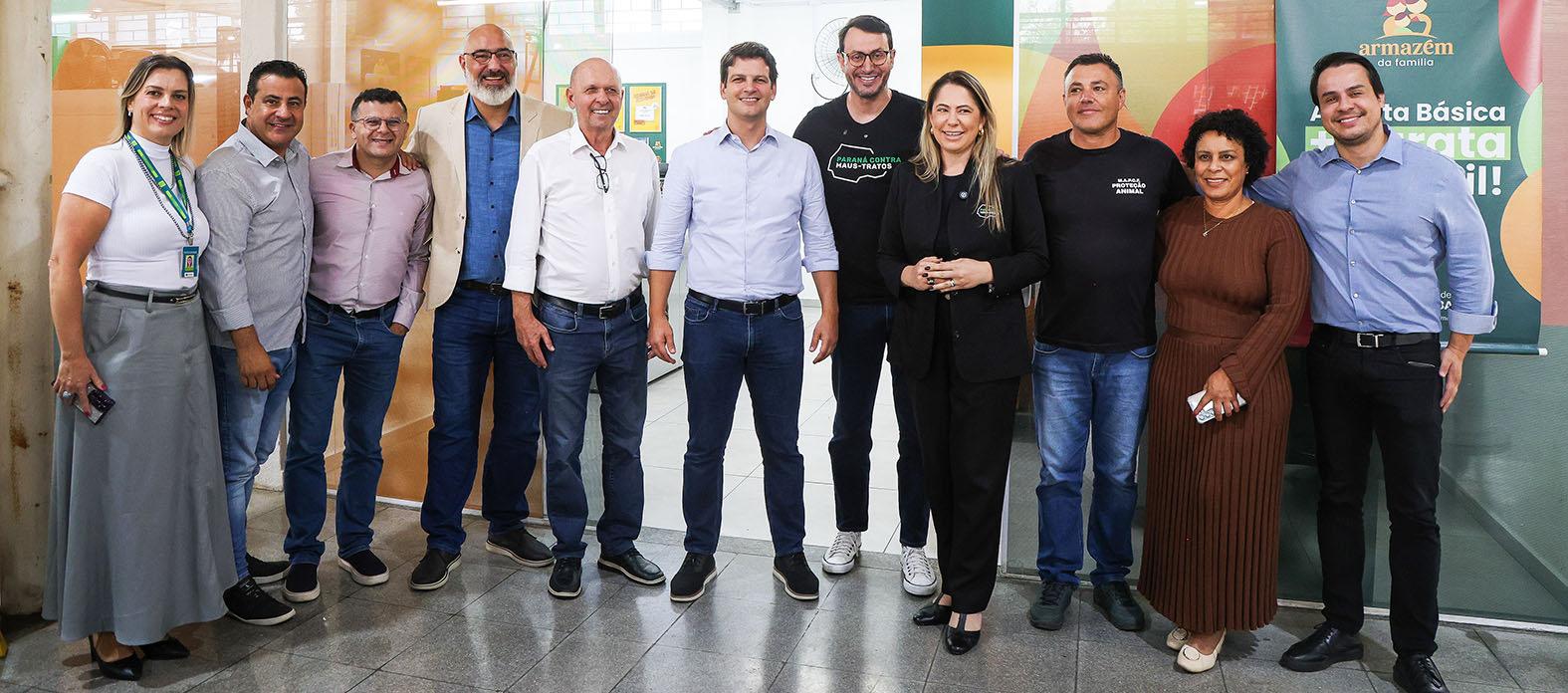 Prefeito Eduardo Pimentel com o secretário de Segurança Alimentar e Nutricional, Leverci Silveira, o deputado federal Matheus Laiola, e a vereadora Andressa Bianchessi, assina autorização para aquisição de ração para venda nos Armazéns da Família