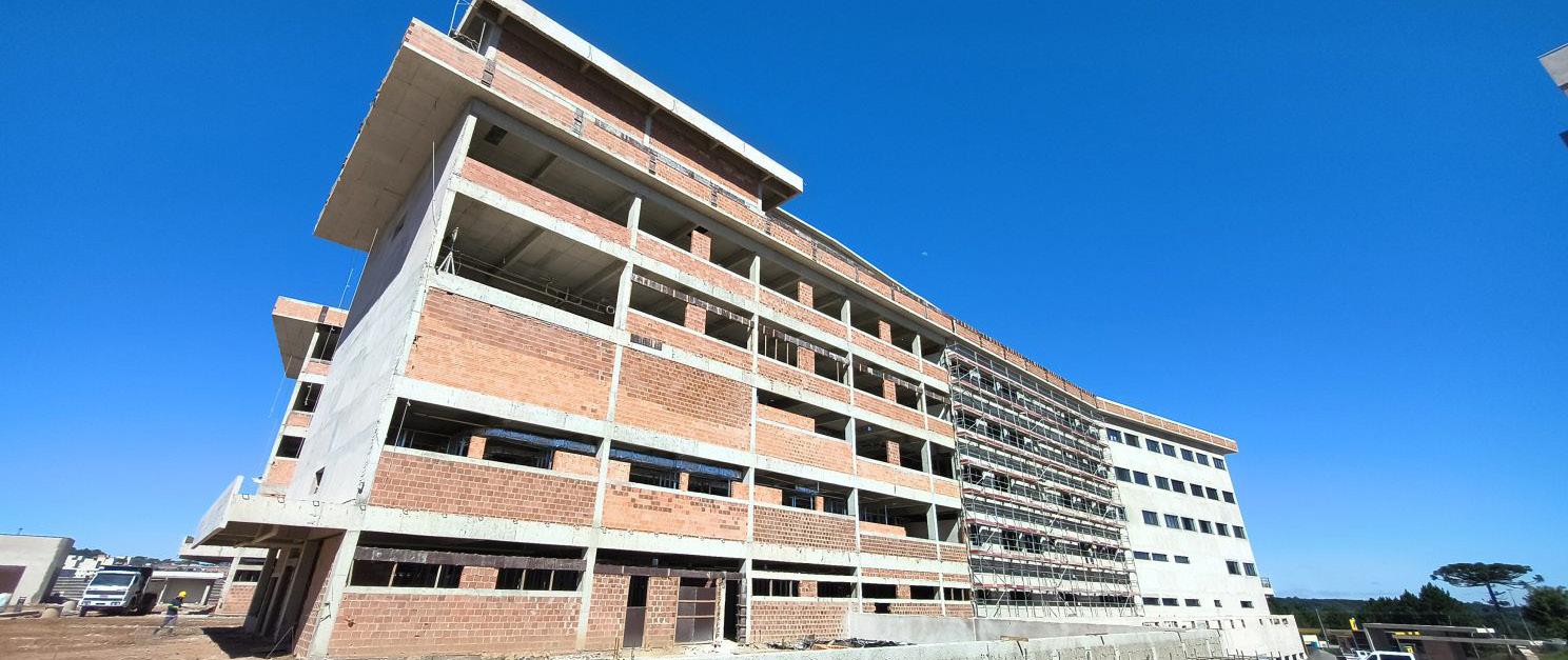 aos atendimentos de urgência e emergência. Com essa fase finalizada, os trabalhos avançam agora para a etapa de revestimentos e instalações em diferentes frentes da obra. “Com a estrutura em concreto armado já concluída, incluindo o heliponto, os trabalhos seguem com serviços de alvenaria, revestimentos, instalações elétricas e hidráulicas, gases medicinais, estrutura em drywall e infraestrutura de ar-condicionado”, explica a gestora do contrato do hospital, Jaqueline Ribas. Os serviços abrangem o prédio principal, guaritas