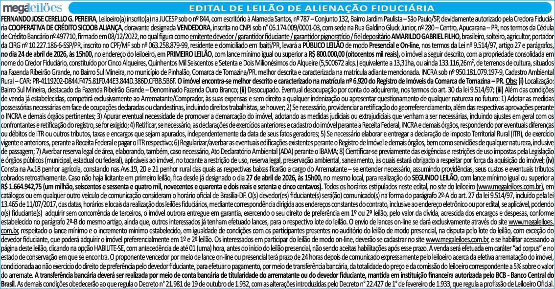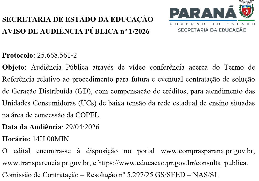 de Prazo Pregão Eletrônico nº 033/2026 A Pregoeira designada pelo Decreto nº 389/2023, no uso de suas atribuições, torna público e para conhecimento dos interessados em participar da licitação em epígrafe, a qual tem por objeto a Contratação de empresa especializada na Prestação de Serviços de Locação de grades de isolamento, house mix, palco, mesas, cadeiras e tendas para atender às necessidades da Prefeitura Municipal de Pinhais e Pinhais Previdência, que foram efetuadas alterações no edital. Diante das alterações referidas, fica designado o dia 05/05/2026, às 09:30 horas no mesmo local mencionado anteriormente. VALOR MÁXIMO: R$ 2.404.344,12. O Edital alterado estará disponível aos interessados, nos sites www.gov.br/compras https://www.gov.br/pncp/pt-br e www.pinhais.pr.gov.br link licitações do dia 15/04/2026 ao dia 04/05/2026. Informações: poderão ser obtidas nos sites acima relacionados ou pelo email: esmeraldacn@pinhais.pr.gov.br, das 08:00h às 12:00h e das 13:00h às 17:00h. Pinhais, 13/04/2026.