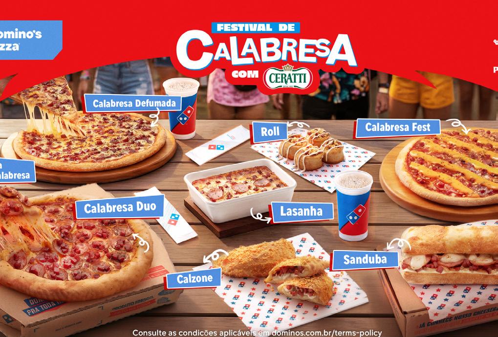 ções”, afirma. O festival apresenta três novas versões de pizza: Calabresa Fest, que combina diferentes cortes do ingrediente com queijos e temperos; Duo Calabresa, com duas variações da proteína; e Calabresa Defumada, que aposta em um sabor mais intenso com cebola e queijo. Além das pizzas, a calabresa também aparece em outras categorias do cardápio. Entre as novidades estão lasanha, calzone, roll (enroladinhos de massa), sanduíche no pão ciabatta e até borda recheada, ampliando as opções para diferentes momentos de consumo. Os produtos já estão disponíveis em todos os canais de venda da Domino’s Pizza, incluindo aplicativo, site, WhatsApp, telefone e lojas físicas. No app, novos usuários contam com desconto de boas-vindas no primeiro pedido.