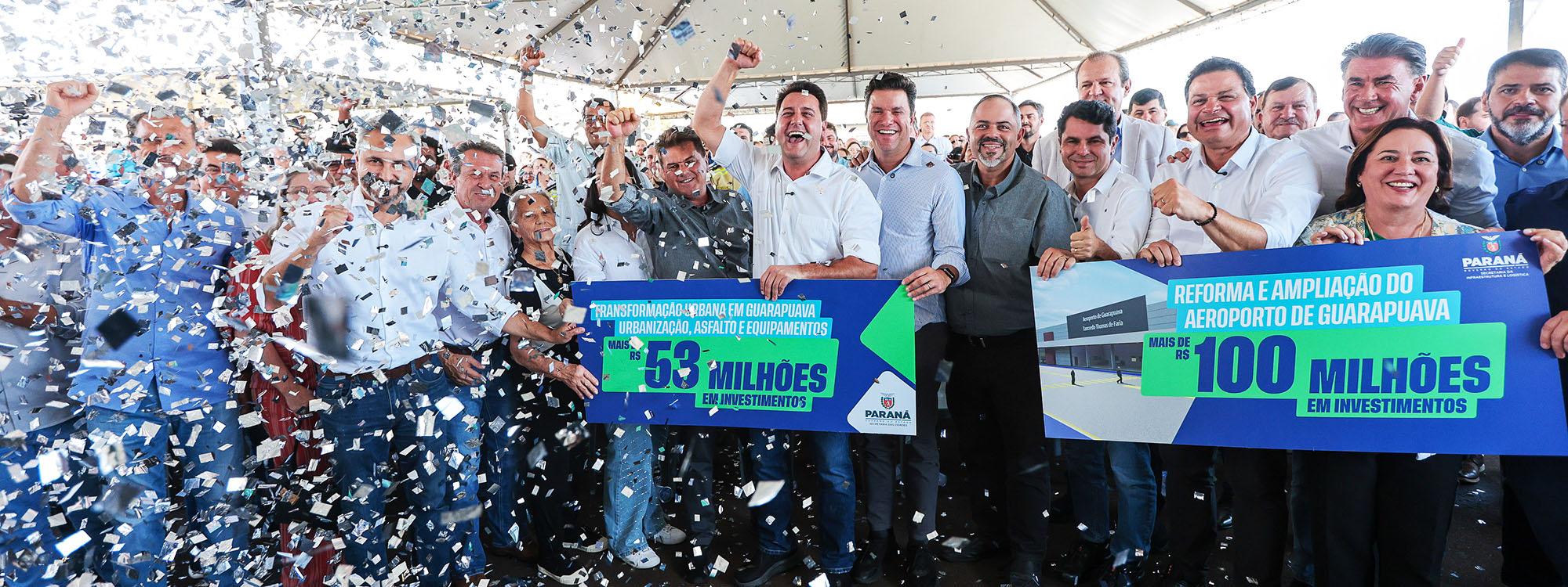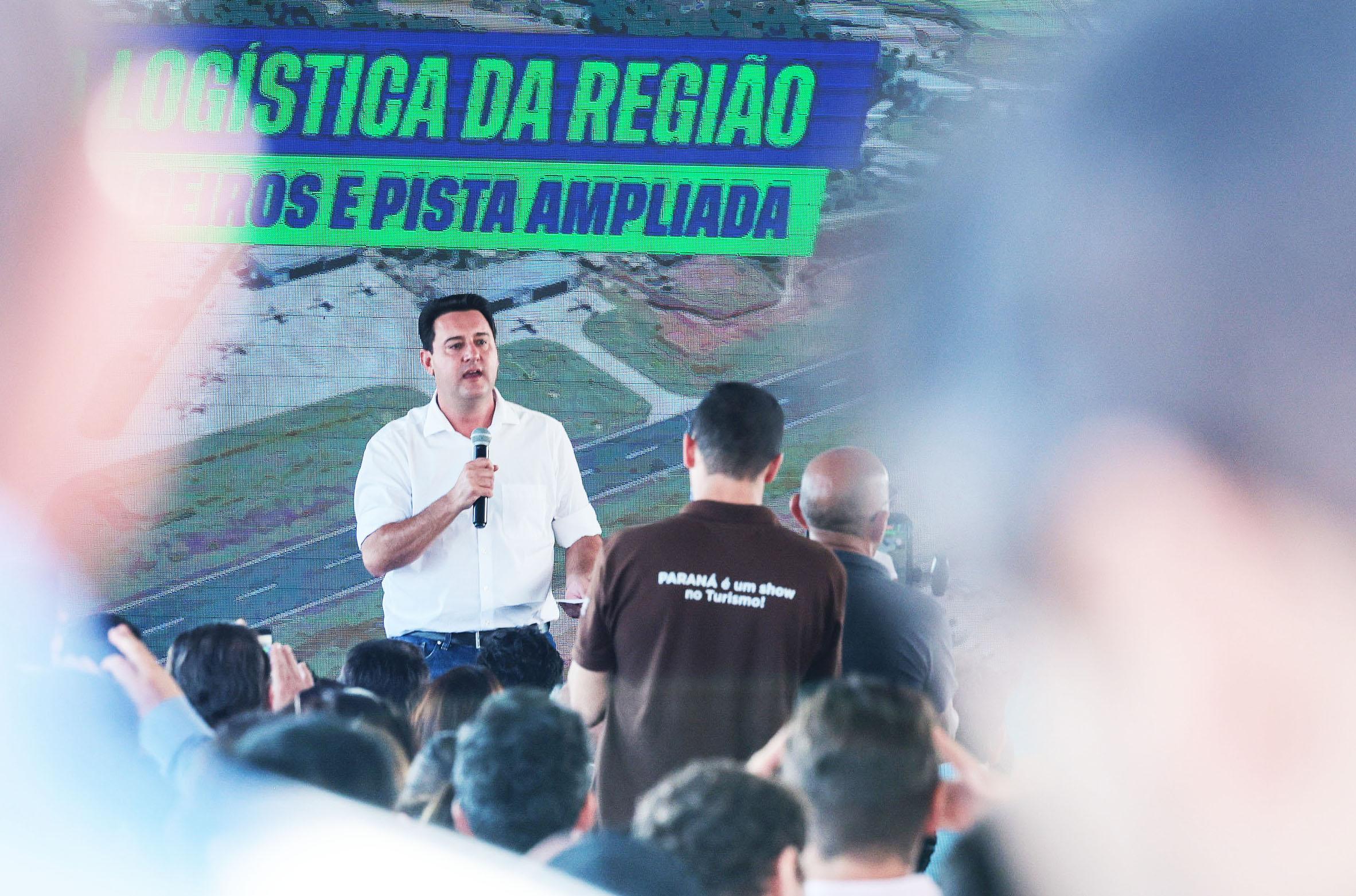 O governador Carlos Massa Ratinho Junior anunciou na sexta-feira (20) um pacote de mais de R$ 190 milhões em obras para Guarapuava, no Centro-Sul do Estado. Os recursos são para ampliação do Aeroporto Tancredo Thomas De Faria, construção do Mercado Municipal e obras de infraestrutura urbana e segurança pública. Ele também lançou o edital para duplicação da PR-170, até o município de Pinhão.