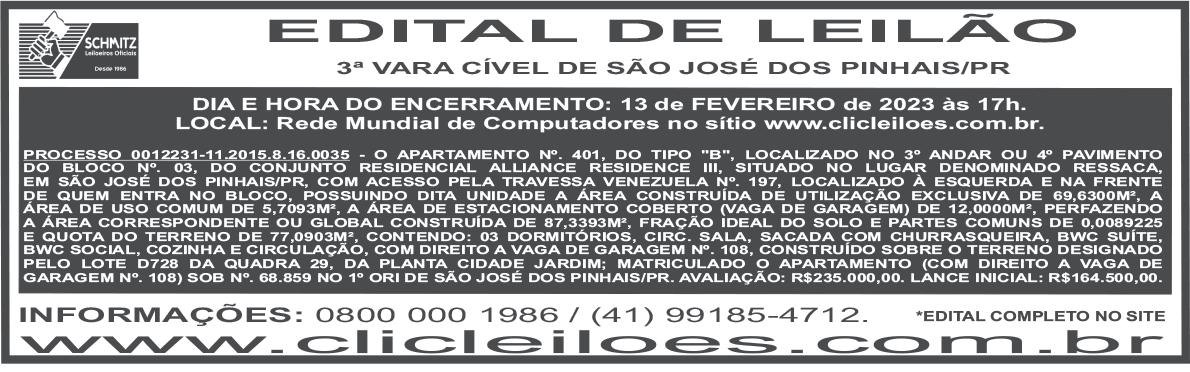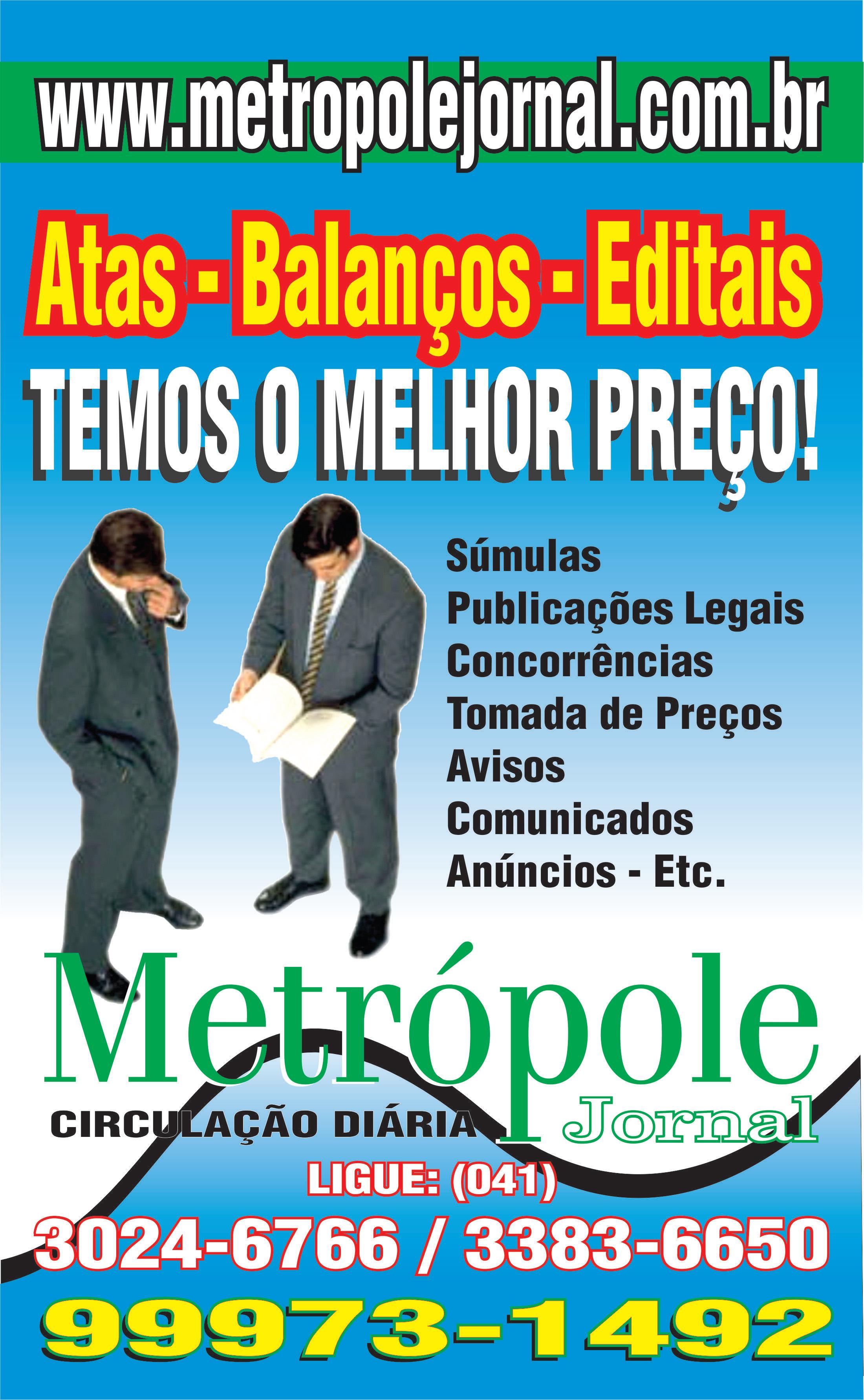 CURITIBA / PR - EDITAL CENTER LTDA CNPJ nº 04.150.383/0001-35 Diretor Comercial: Maurício Mosson Rua Amintas de Barros, 164 – Centro/Conj 46 – CEP 80.060-205 Fones: (41) 3024-6766 - Email: cial@ctbametropole.com.br SÃO JOSÉ DOS PINHAIS / PR - Fones: (41) 3383-6650 Departamento Comercial / Administrativo Email: adm.metropole@hotmail.com Contato Redação: e-mail: lustosa18@gmail.com - lustosa@onda.com.br xilus1951@outlook.com Filiado: Sindicato das Empresas de Jornais e Revistas do Estado do Paraná Filiado a ADI – PR – Associação dos Diários do Interior Representante em Santa Catarina, Paraná, São Paulo, Rio de Janeiro e Brasília: Central e Comunicação – SCS – QD 02 Bl. D/Salas 1002/1003 – Edif. Oscar Niemeyer CEP 70.316-900 – Brasília – Distrito Federal Fones: (41) 3323-4071 – (41) 98133-3400 As matérias opinativas que venham assinadas, não expressam necessariamente a opinião do jornal 2 | Quarta-feira, 23 de Novembro de 2022 | Edição 5598 | PUBLICAÇÕES LEGAIS / NACIONAL
