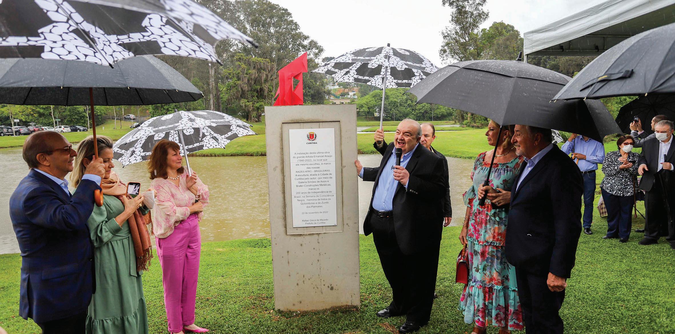 Tingui, a instalação de uma das suas últimas obras, uma peça de 8 metros de altura em metal vermelho. A entrega foi feita pelo prefeito Rafael Greca, que lembrou a importância do artista para a cultura brasileira, tanto pela sua produção quanto pelas peças da sua coleção. “Emanoel Araújo foi um prodígio de talento, grande gravador, notável escultor e também colecionador, deixando ao patrimônio histórico nacional cerca de 6 mil obras de arte que podem ser vistas no Museu Afro Brasil, em São Paulo”, disse.