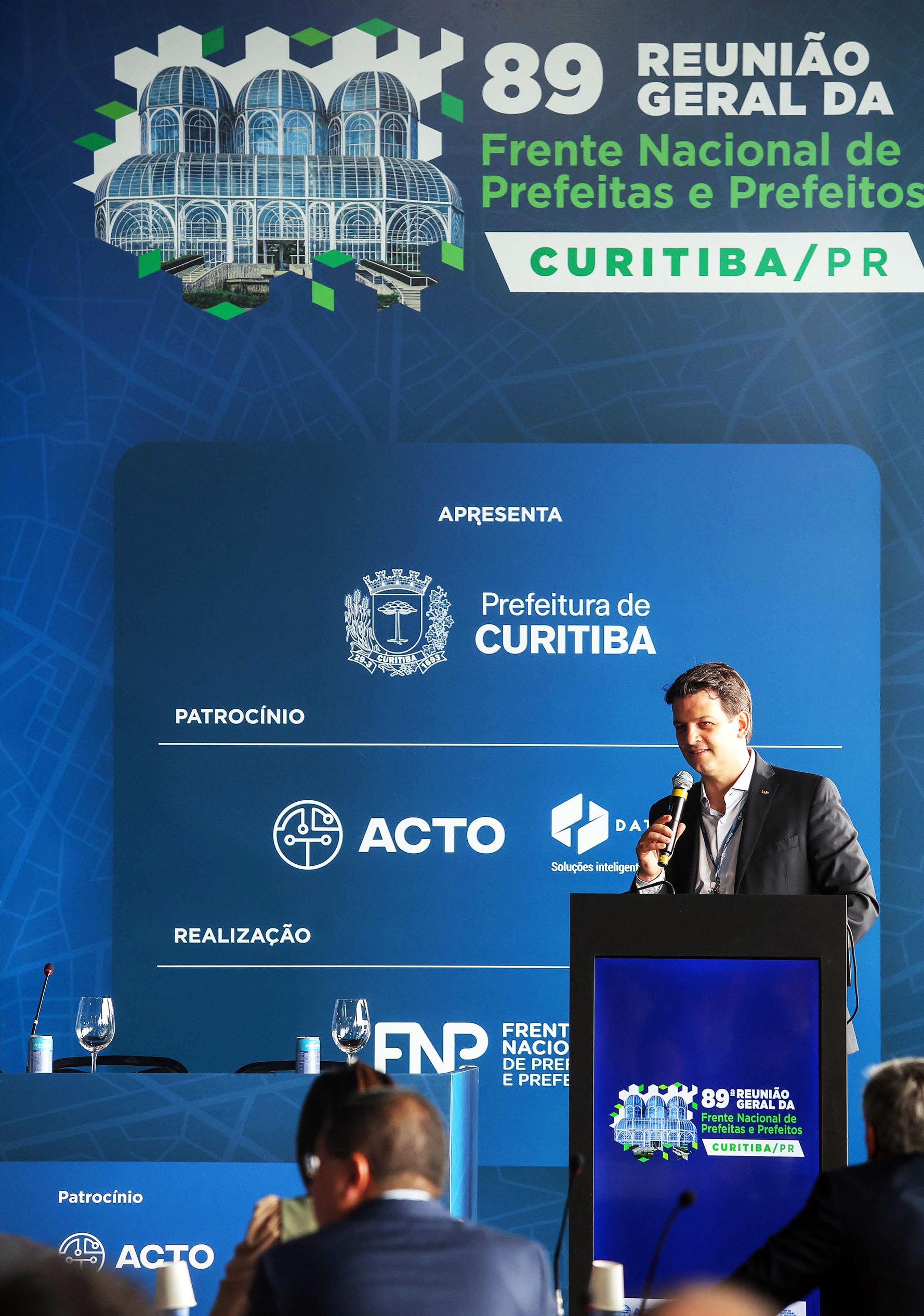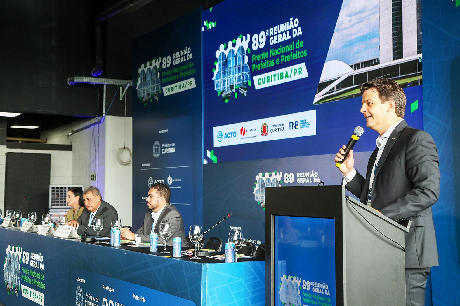 O prefeito de Curitiba, Eduardo Pimentel, participa, na manhã desta terça-feira (24/3), da abertura da 89ª Reunião Geral da Frente Nacional de Prefeitas e Prefeitos (FNP) no estádio Arena da Baixada. O evento reúne mais de 100 prefeitos e prefeitas de todo o País para discutir os principais desafios das cidades brasileiras. O vice-prefeito de Curitiba, Paulo Martins, também participou da abertura. “Neste fim de semana Curitiba faz 333 anos e é com muita alegria que vamos discutir aqui assuntos importantes para o futuro das cidades”, disse Eduardo Pimentel.