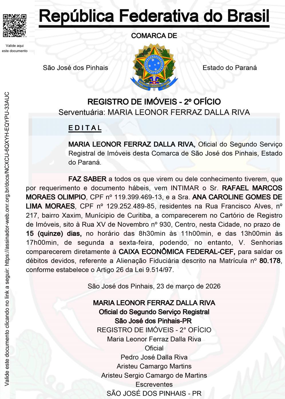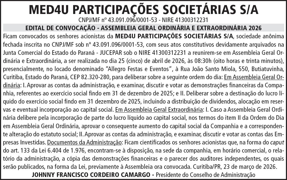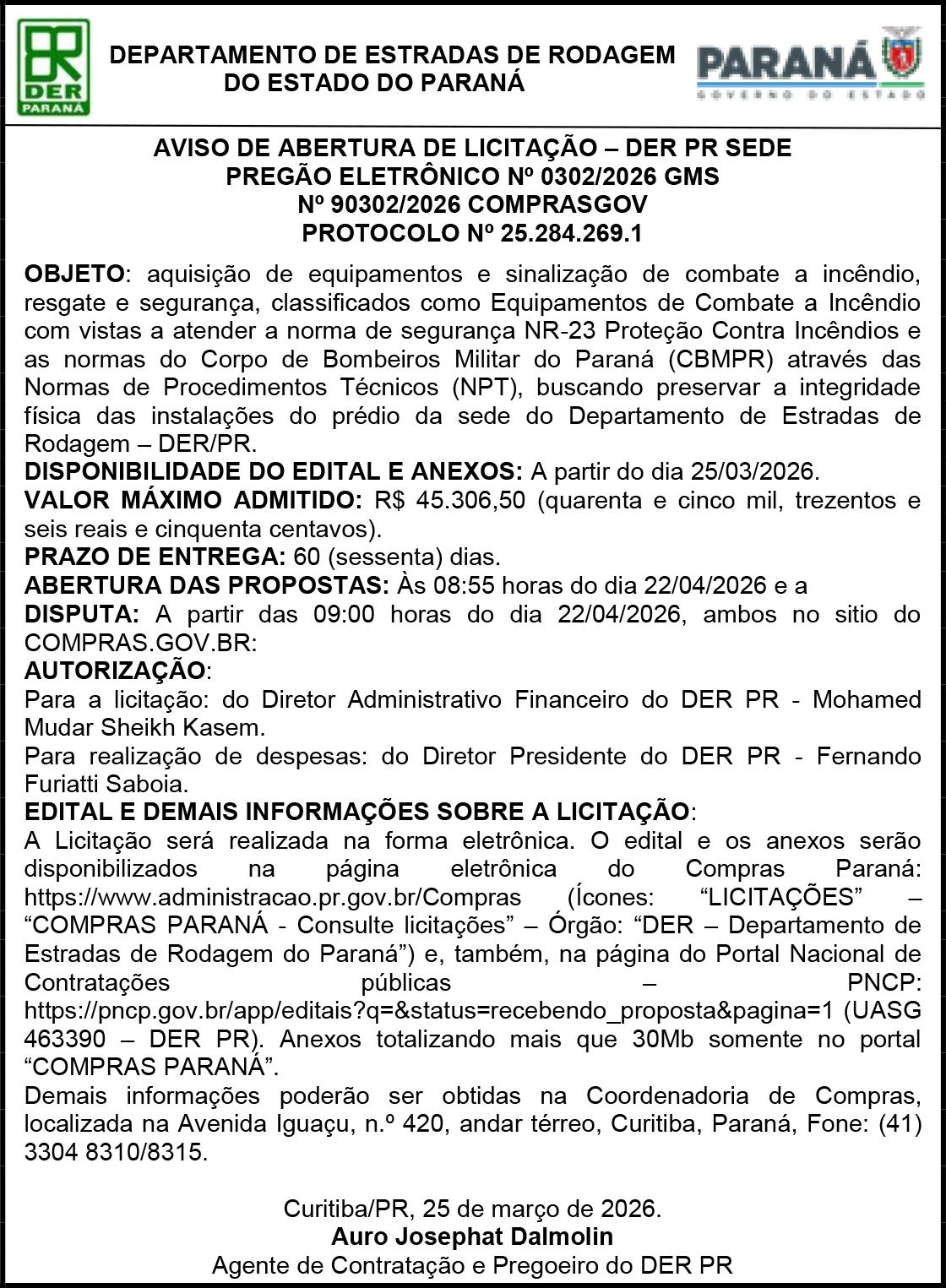 II. O item 4.6 do edital teve os endereços de e-mail dos responsáveis alterados. III. Em cumprimento ao item 15.15 do edital originário, os valores unitários da tabela constante no item 1.2.2, do Anexo I-A do edital, foram reajustados em 4,46%, devendo ser considerada a tabela apresentada no edital retificado. IV. Demais disposições do edital continuam inalteradas. O Edital alterado estará disponível aos interessados, nos sites https://www.gov.br/pncp/pt-br e www.pinhais. pr.gov.br, link licitações, a partir do dia 25/03/2026. Maiores informações poderão ser obtidas por meio dos endereços de e-mail edson.rigo@pinhais.pr.gov.br e wilson.alves@pinhais.pr.gov.br. Pinhais, 24/03/2026. Pregão Eletrônico nº 032/2026 - Sistema de Registro de Preços Compras GOV Nº 90032/2026 Objeto: Confecção de Troféus Personalizados para a Prefeitura Municipal de Pinhais. Tipo de Licitação Menor Preço. Valor Máximo: R$ 129.416,14. Data de Início Recebimento das Propostas: 25/03/2026. Abertura da Sessão: dia 09/04/2026, às 09:00 horas (horário oficial de Brasília) no site www.gov.br/ compras - Portal de Compras do Governo Federal. Edital: Estará disponível aos interessados, nos sites www.gov.br/compras https://www.gov.br/pncp/pt-br e www.pinhais.pr.gov.br link licitações do dia 25/03/2026 ao dia 08/04/2026. Informações: poderão ser obtidas nos sites acima relacionados ou pelo email: catia.santos@pinhais.pr.gov.br. Pinhais, 24/03/2026.