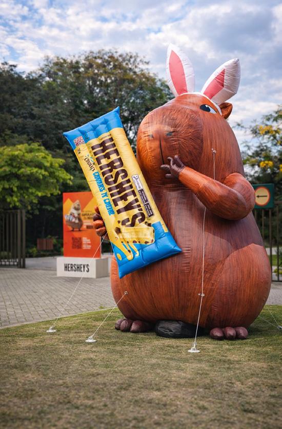 Quem passa pelo Park Shopping Barigui, em Curitiba, tem se deparado com uma cena inusitada: uma capivara inflável gigante, com cerca de 5,5 metros de altura, instalada às margens da via. A intervenção urbana marca o lançamento da nova campanha de Páscoa da The Hershey Company, que apresenta a “Capibarra” como mascote oficial