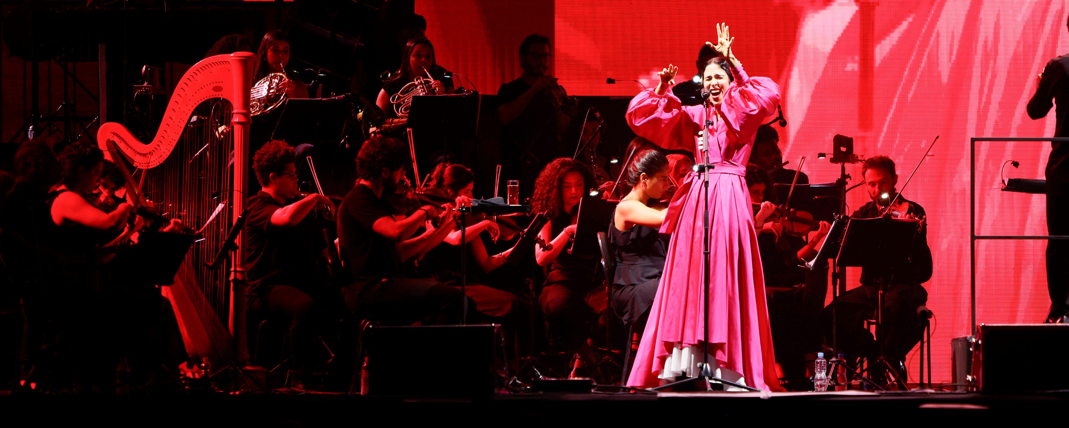 No palco, Marisa conta com sua banda base — Dadi Carvalho (violão e guitarra), Pupillo (bateria), Alberto Continentino (baixo) e Pedrinho da Serrinha (cavaquinho e percussão) — e a orquestra com músicos de cordas, sopros, percussão, harpista e pianista, garantindo