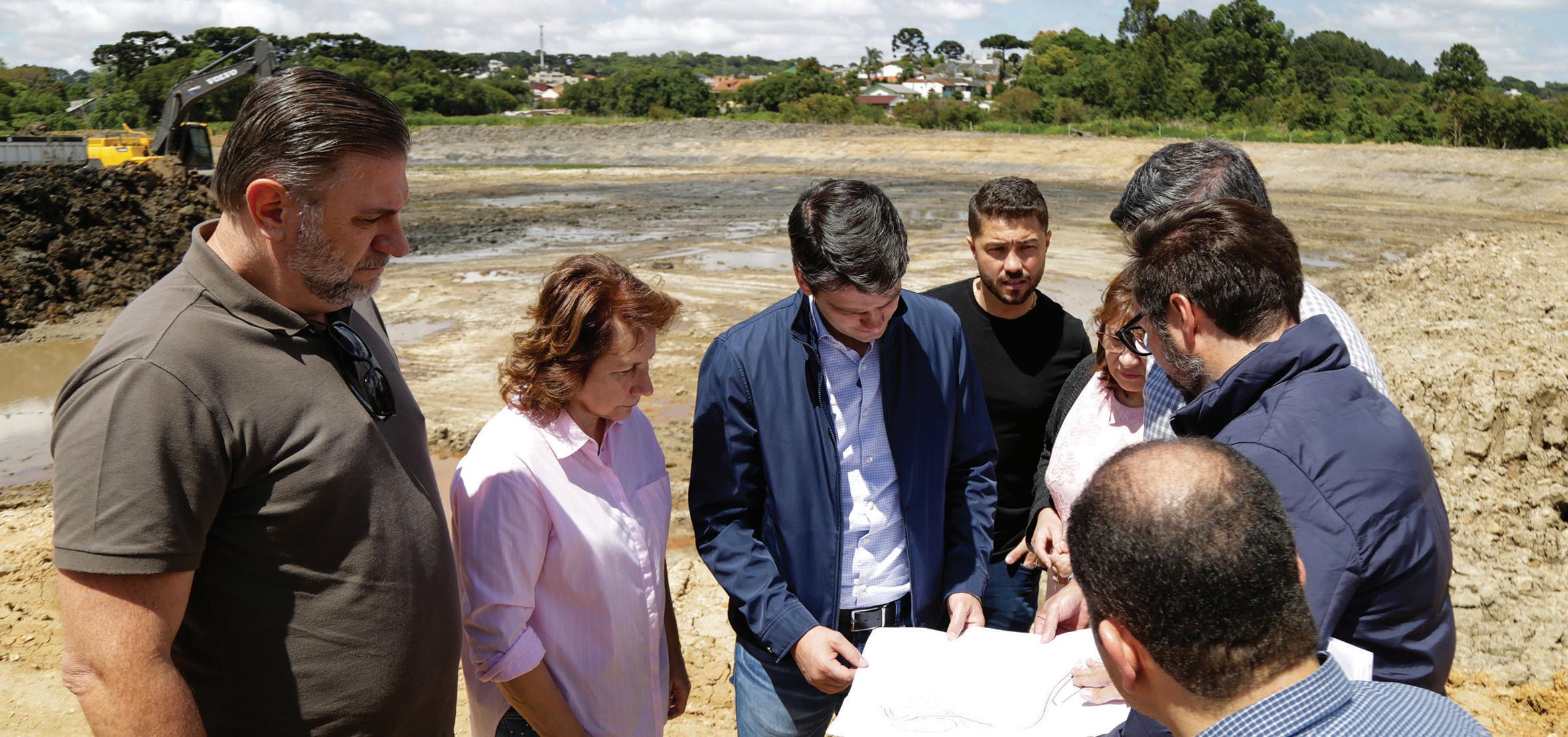 Uma das maiores obras de macrodrenagem recentes da cidade está em andamento no Santa Cândida, no Rio Atuba, afluente do Rio Iguaçu, que sofre com o impacto do crescimento urbano e das chuvas intensas, que aumentam o risco de enchentes. Na manhã desta sexta-feira (24/10), o prefeito Eduardo Pimentel voltou ao canteiro das obras para acompanhar o avanço dos trabalhos e discutir as próximas etapas do projeto que, além de prevenir alagamentos, vai garantir um novo parque para a cidade. “Aqui no Atuba estamos construindo duas grandes bacias de contenção que vão ajudar a resolver o problema dos alagamentos na região norte, na divisa com Colombo e Pinhais”, disse o prefeito Eduardo Pimentel.