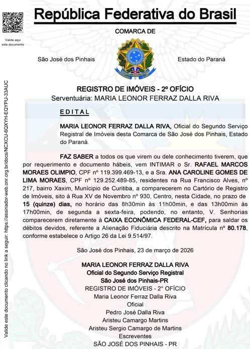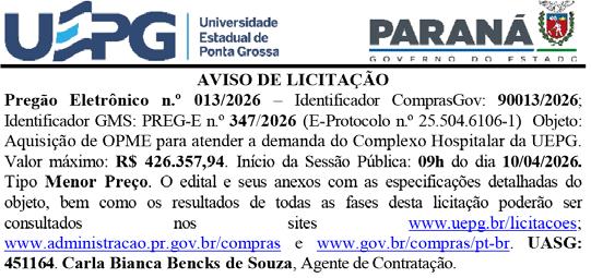 PARTICIPAÇÕES SOCIETÁRIAS S/A CNPJ/MF nº 43.091.096/0001-53 - NIRE 41300312231 EDITAL DE CONVOCAÇÃO - ASSEMBLEIA GERAL ORDINÁRIA E EXTRAORDINÁRIA 2026 Ficam convocados os senhores acionistas da MED4U PARTICIPAÇÕES SOCIETÁRIAS S/A, sociedade anônima fechada inscrita no CNPJ/MF sob nº 43.091.096/0001-53, com seus atos constitutivos devidamente arquivados na Junta Comercial do Estado do Paraná - JUCEPAR sob o NIRE 41300312231 a reunirem-se em Assembleia Geral Ordinária e Extraordinária, a ser realizada no dia 25 (cinco) de abril de 2026, às 08:30h (oito horas e trinta minutos), presencialmente, no locado denominado “Allegro Festas e Eventos”, à Rua João Santo Miola, 550, Butiatuvinha, Curitiba, Estado do Paraná, CEP 82.320-280, para deliberar sobre a seguinte ordem do dia: Em Assembleia Geral Ordinária: I. Aprovar as contas da administração, e examinar, discutir e votar as demonstrações financeiras da Companhia, referentes ao exercício social findo em 31 de dezembro de 2025; e II. Deliberar sobre a destinação do lucro líquido do exercício social findo em 31 dezembro de 2025, incluindo a distribuição de dividendos, alocação em reservas e eventual incorporação ao capital social. Em Assembleia Geral Extraordinária: I. Caso a Assembleia Geral Ordinária delibere pela incorporação de parte do lucro líquido ao capital social, nos termos do item II da Ordem do Dia em Assembleia Geral Ordinária, aprovar o consequente aumento do capital social da Companhia e a correspondente alteração do estatuto social; II. Aprovar as contas da administração, e examinar, discutir e votar as contas das Empresas Investidas. Documentos da Administração: Ficam cientificados os senhores acionistas que, na forma do caput do art. 133 da Lei 6.404 de 1.976, encontram-se à disposição, na sede da companhia, em horário comercial, o relatório da administração, a cópia das demonstrações financeiras e o parecer dos auditores independentes, os quais serão publicados, na forma da Lei, previamente à Assembleia ora convocada. Curitiba/PR, 23 de março de 2026.