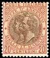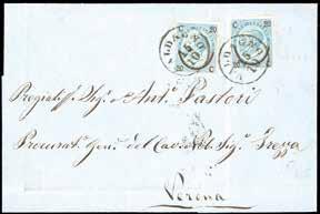 69 * 1866 - 20 cent. su 15 cent. Ferro di cavallo, I tipo (Regno 23), due esemplari, perfetti, su lettera di doppio porto in tariffa italiana da Valdagno 15/10/1866 a Verona, dove giunse il successivo 16 ottobre, giorno di entrata in esercizio dell’Amministrazione Postale Italiana. Interessante, per specialista.