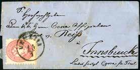 36 * 1866 - 5 soldi rosa, dent. 9 1/2 (43), ottimo stato, su sovracoperta di lettera da Venezia 15/1/1866 a Innsbruck. Primi giorni della tariffa unificata per l’Impero Austriaco di 5 soldi.