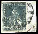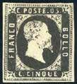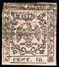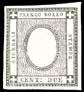 5 1850 - 10 cent. grigio nero, I tiratura, ritocco della dicitura “centes” (2b/k), perfetto, usato a Milano. Varietà molto rara, specie negli esemplari della I tiratura. Cert. Sorani e Fiecchi. (cat. Sassone € 12.000 in proporzione).