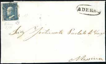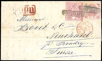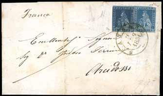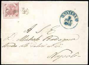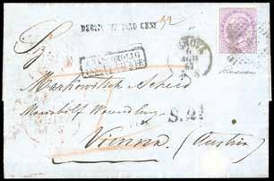 72 * 1866 - Lettera da Padova per Corfù del 22 agosto 1866 affrancata in tariffa di primo porto per 60 centesimi con 20 c. su 15 c. terzo tipo e un 40 centesimi DLR (T20, 25). Manoscritto “Via di Trieste” cancellato e aggiunto “Brindisi”, essendo Trieste ancora austriaca. Bollo riquadrato “Piroscafi Postali Italiani” applicato a Brindisi e al verso bollo di transito del 27 agosto e di arrivo a Corfù del 22 agosto (Calendario Giuliano). Primi usi dei francobolli italiani nelle località liberate nel luglio 1866. La lettera fu trasportata con un vapore della Compagnia Peirano & Danovaro che dal 1862 gestiva per conto dell’Amministrazione Postale Italiana la linea settimanale tra Napoli e Ancona, effettuando anche lo scalo di Corfù. Il conflitto tra Italia e Austria del 1866 complicò la situazione perché il servizio Lloydiano fu sospeso dal 24 giugno al 13 settembre, per cui venne a mancare il mezzo di collegamento tra l’area italiana e quella greca. Non per questo la Peirano & Danovaro rinunciò alla propria attività.