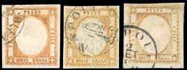 19 * 1861 - 10 soldi bruno, II tipo (31), tre esemplari, su lettera di triplo porto da Venezia 4/2/1861 a Milano, dove venne tassata 1 lira per cinque porti Sardi. Interessante e non comune porto multiplo.