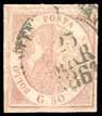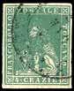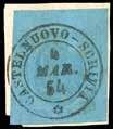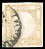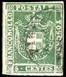47 1854 - 75 cent. verde e nero, marca da bollo calcografica (10), perfetta, recuperata da documento e utilizzata postalmente con annullo di “Battaglia 24 set”. Bella e rara. Ferrario, cert. Sorani.