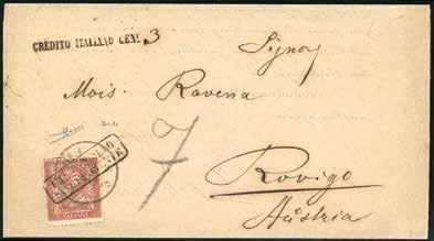 67 * 1866 - 5 soldi rosa, dent. 9 1/2 (43), perfetto, su fresca lettera scritta a Lendinara il 15/9/1866 (già italiana dal 10 luglio) per Venezia, inoltrata privatamente a Chioggia (ancora austriaca), dove venne messa in posta il giorno 16 settembre. Interessante e rara testimonianza di inoltro” d’emergenza” di corrispondenza tra il Veneto già italiano e quello austriaco, stante l’interruzione delle relazioni postali dirette a causa del conflitto in essere. Documento di grande interesse storico postale. Dettagliato cer. Colla.