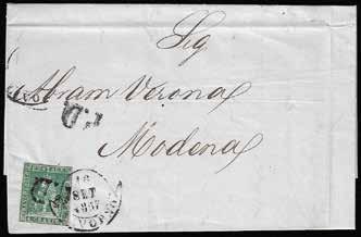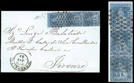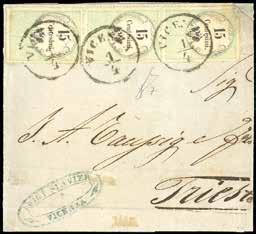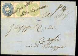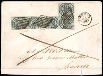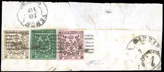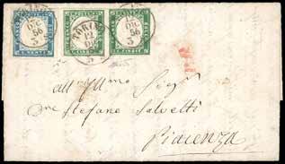 46 * 1854 - 15 cent. verde e nero, marca da bollo calcografica (7), eccezionale striscia verticale di tre, un esemplare difettoso, su lettera in parte restaurata, da Vicenza 1/4/1854 a Trieste, bollo d’arrivo. Non si conoscono altre strisce di tre o maggiori, su lettera, di questo fiscale. Rarità. Cert. Ferrario.