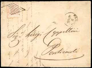29 * 1864 - Lettera da Conegliano per Milano del 5 marzo 1964, affrancata con due esemplari da 3, uno da 5 e uno da 10 soldi della IV emissione (37a, 38, 39), in tariffa da 21 soldi dalla II sez. austriaca alla II italiana. Rarissima affrancatura tricolore composta solo da esemplari della IV em. Con francobolli perfetti e leggero annullo, accompagnato dal “PD” in rosso. Al verso bolli ambulante e di arrivo. Bellissima e rara. Gazzera, Fabris e cert. Bottacchi.