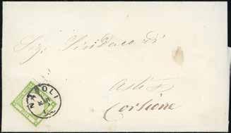 74 * 1866 - Lettera da Ceriana (Imperia) per Revine (Treviso) del 24 luglio affrancata per 60 centesimi con 20 centesimi I tipo e 40 centesimi (23,T20), a formare la tariffa per le corrispondenze avviate per la Via di Svizzera, secondo le intenzioni dell’addetto al servizio di spedizione di Ceriana. La lettera però fu avviata per le normali vie padane a seguito della liberazione delle località trevigiane già nella seconda metà del luglio 1866. Al verso bolli di transito di San Remo del 24, Genova 25, Milano 25, Treviso 29, Ceneda e Serravalle dove giunse il 4 agosto. Interessante.