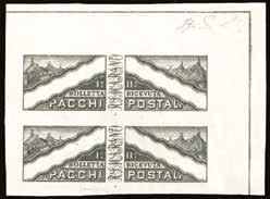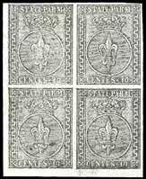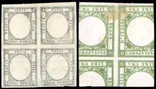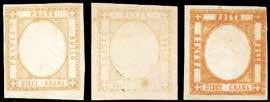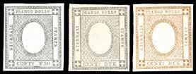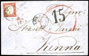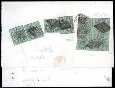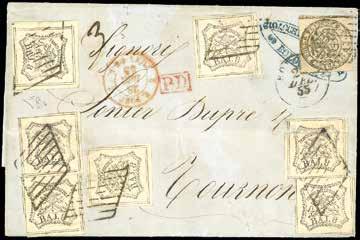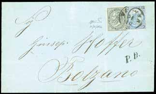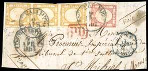 3 r 1858 - 10 cent. nero, carta a mano, striscia verticale di tre e 5 soldi rosso chiaro, I tipo (2,25a), perfetti, su due distinti frammenti, tutti annullati a Bassano 12/11. I due frammenti sono stati ricollocati nella posizione originaria su una fotocopia della raccomandata a cui appartenevano e che venne posta in vendita nel 1959 dalla Casa d’aste irlandese Shanahan’s lotto 1265. L’intera vendita venne trafugata e le lettere furono ridotte a frammenti nel tentativo di camuffarne la provenienza. Interessante insieme, un tempo costituente un’affrancatura mista di grandissima rarità e di qualità impeccabile, ora vivida testimonianza di uno dei più estesi e gravi “delitti filatelici”. Dettagliato cert. Bottacchi. Allegata fotocopia della pagina del catalogo d’asta.