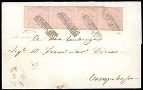 42 * 1865 - Lettera da Smirne per Genova del 15 dicembre 1865 con affrancatura di 28 soldi con coppia e striscia di tre del 5 soldi + 3 soldi (43L, 42L). Tagli di disinfezione, bollo in cartella a lato “Piroscafi Postali Italiani” e “P. D.” in azzurro. Al verso, bollo in transito di Brindisi del 20 dicembre e di arrivo del 22. Francobolli in discreto stato, non comune.