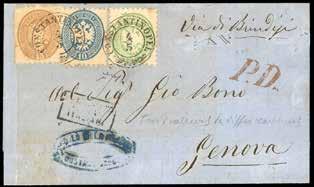 25 * 1863 - Lettera da Venezia per Genova del 18 agosto 1863, in tariffa triplo porto di 48 soldi, con tre esemplari del 15 soldi e uno da 3 soldi (32, 35), perfetti, bollo di arrivo a Genova del 20 agosto. Rara affrancatura di ottima qualità. Cert. Vaccari.