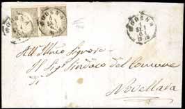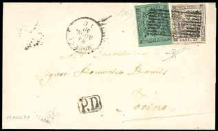 16 * 1860 - 10 soldi bruno, II tipo (31), un esemplare al recto e uno al verso per il diritto di raccomandazione, perfetti, su lettera raccomandata da Legnago 6/6/1860 a Pavia, non tassata in arrivo come consueto perché godeva di franchigia in Italia. Interessante e non comune. E.Diena.