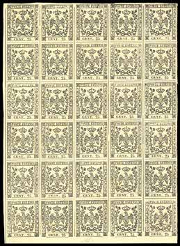 89 **/* 1852 - 25 cent. camoscio chiaro (4), blocco di 30 esemplari, angolo di foglio, gomma originale integra, traccia di linguella per tre soli esemplari, perfetto, qualche consueto punto di ossidazione al verso. Raro. G.Bolaffi, G.Oliva, A.Diena, cert. Ferrario.