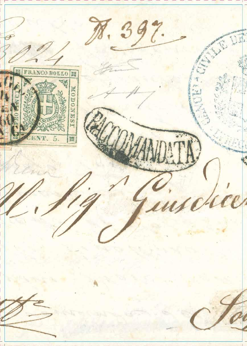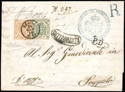 94 * /r 1854 - 5 cent. verde, punto dopo le cifre, 15 cent. giallo e, al verso per il diritto di raccomandazione, 25 cent. camoscio chiaro, entrambi senza punto dopo le cifre (7,3,4), perfetti, su gran parte di lettera raccomandata da Scandiano a Reggio, 16/12/1854. Rara affrancatura tricolore, di ottima qualità. G.Bolaffi, A.Diena.